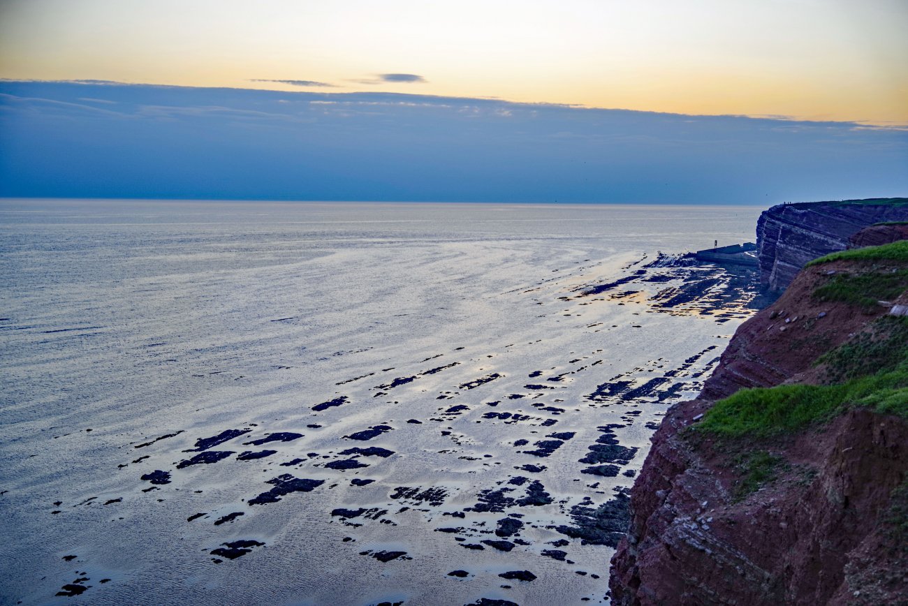 Genau genommen sind es zwei Inseln, die eine, eine 61 Meter hohe Steilküste aus Buntsandsteinfelsen, die andere, eine 0,7 qkm große Sanddüne. Ein Paradies mitten im Meer. Natur pur, klare Luft, sauberstes Wasser, schneeweißer Sand und so viel Sonne, wie kaum anderswo in Deutschland. Eine Oase der Ruhe, Zeit zum Abschalten, Zeit für Entspannung. Der ideale Ort zum Entschleunigen. Die Insel ist eines der begehrtesten Reiseziele Deutschlands und wird jährlich von über 350.000 Gästen besucht. Den meisten von ihnen, den Tagesausflüglern, bleiben nur wenige Stunden die Insel zu erkunden. Ein Muss ist der Inselrundgang, ein 3 Kilometer langer Weg um das „Oberland“, das man entweder zur Fuß über eine 184 Stufen zählende Treppe bewältigt oder mit einem Fahrstuhl erreichen kann. Dort angekommen führt der Weg mit überall freiem Blick auf das weite Meer und den Horizont vorbei an schroffen Felsformationen zum „Lummenfelsen“, einem der kleinsten Naturschutzgebiete Deutschlands. Hier nisten und brüten Seevögel wie Dreizehenmöwen, Basstölpel, Eissturmvögel, Tordalken und Trottellummen, die der Felsen seinen Namen zu verdanken hat. Ziel des Weges ist die „Lange Anna“, eine 46 Meter hoher, alleinstehende Felsnadel, das Wahrzeichen Helgolands. Vom „Oberland“ hat man einen einmaligen Ausblick auf das „Unterland“, die Reede mit den vor Anker liegenden Schiffen, das beheizte Meerwasser-Freischwimmbad „mare frisicum SPA HELGOLAND“, den Hafen und die Nachbarinsel, der „Düne“. Im Halb-Stundentakt bringt die Dünenfähre die Urlauber dort hinüber. An zwei weitläufigen, weißen Sandstränden finden Sonnenhungrige eine ausreichende Anzahl von Strandkörben und viel Platz zum Strandnachbarn. Nie sind diese Strände überlaufen und auch dadurch unvergleichlich.