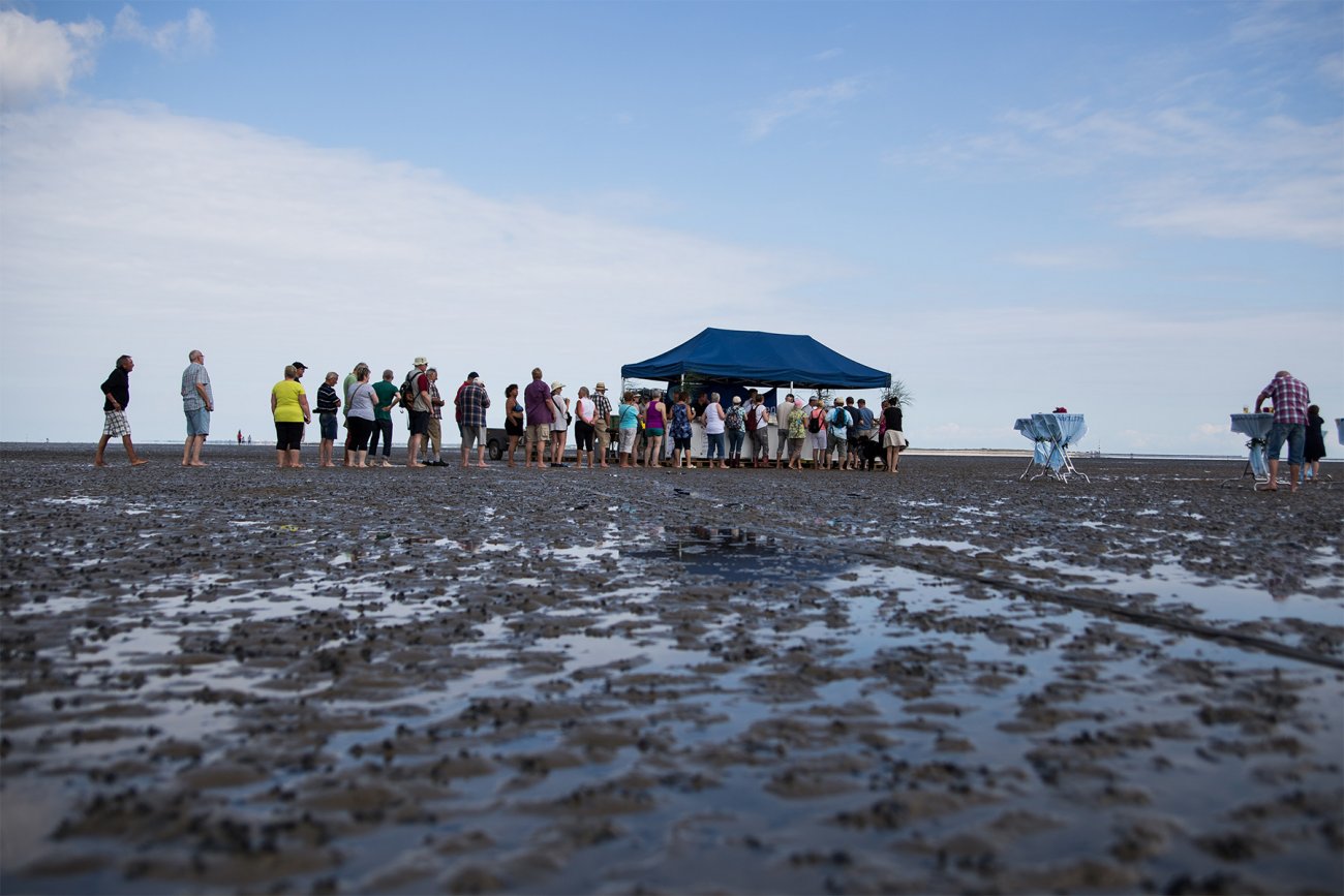 Auf der anderen Seite des seinerzeit neu geschaffenen Deiches erstreckt sich über eine Länge von ca. 4 km ein feinsandiger Strand sowie ein großer Campingplatz. Auf beiden Einrichtungen gibt es Abschnitte für FKK. Ein Meerwasserhallenwellenbad sowie ein Gästehaus mit Kinderspielbereich und einer gut sortierten Bücherei komplettieren das Angebot.
